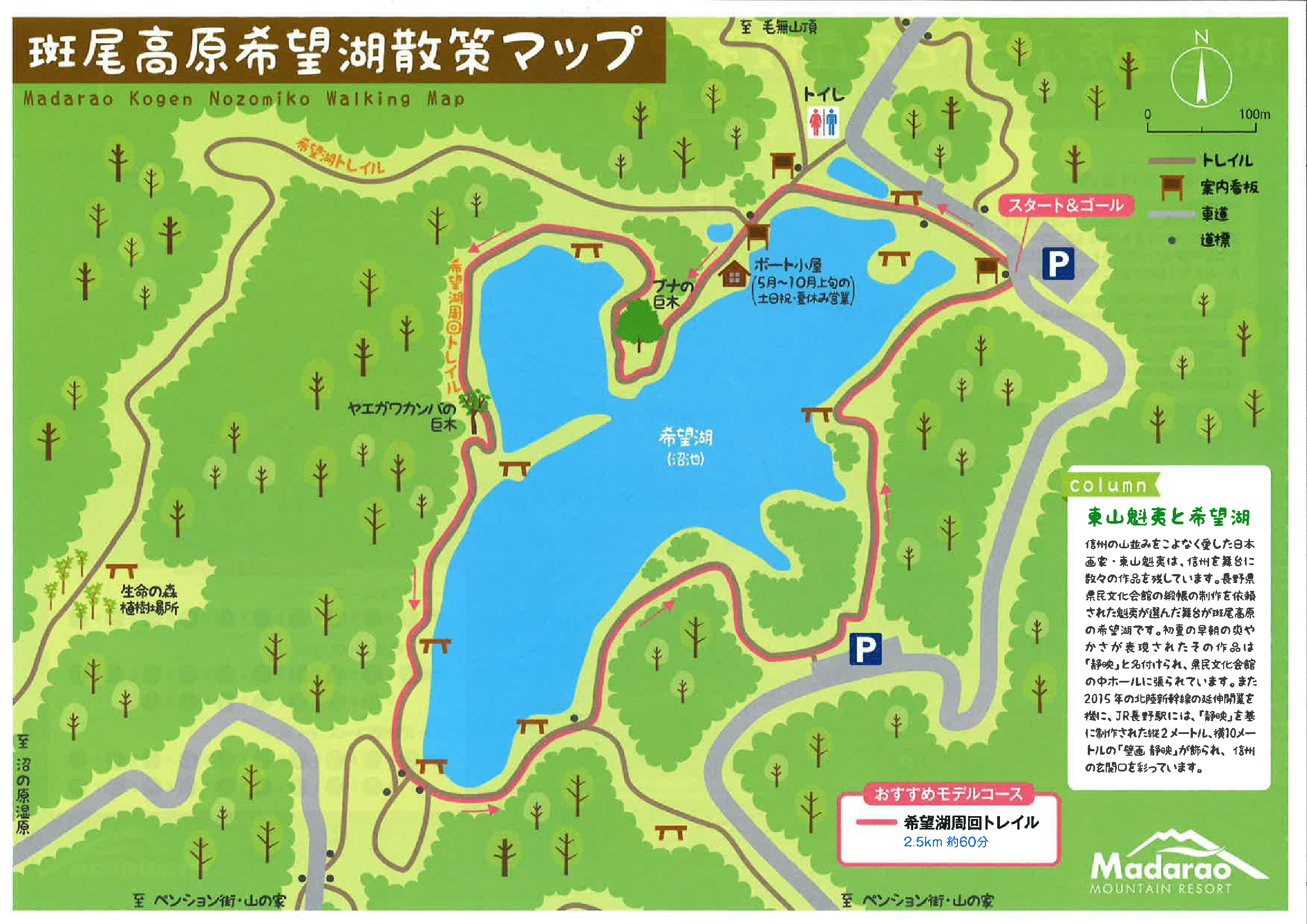 湖を一周する2.5km、約1時間のコースは、湖を眺めながらの散策を楽しめます。シラカバやミズナラの林に囲まれた湖畔には珍しいヤエガワカンバの大木も。